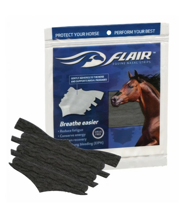 Store FLAIR Strips at room temperature.For best results apply FLAIR Strip 30 minutes prior to riding, exercise, or any other activity that might cause the horse to sweat.Use a clean, dry cloth or paper towel to remove dirt and oil prior to application.This placement provides optimal support for the soft tissue of the nasal passage.FLAIR Strips have a unique adhesive that is designed to flow into and adhere to the horse? hair.Touching the adhesive will reduce its ability to stick to your horse.Additional adhesives may be harmful and are NOT recommended.FLAIR Strips have a unique and gentle adhesive that is developed for the health and safety of the horse.Supporting the nasal passages improves air flow, allowing horses to breathe easier and resulting in?reduced fatigue, quickened recovery, reduced bleedingSS-50SPFLAIR Strips are veterinarian-developed self-adhesive strips that promote optimum respiratory health of equine athletes at every level of competition. The Strips reduce airway resistance and improve airflow when your horse needs oxygen most.FLAIR Strips provide benefits for all horses, including both intensively-trained horses and those that exert themselves during occasional weekend competitions or trail rides.FLAIR Strips were developed by a team of veterinarians interested in protecting the respiratory health of hard-working horses.The introduction of FLAIR Strips in 1999 created awareness that supporting the nasal passages could improve horsesbreathing and respiratory health. In the nearly twenty years since then, significant university and private clinical research has shown that supporting the nasal passages improves air flow, allowing horses to breathe easier and resulting in:reduced fatiguequickened recoveryreduced bleedingScience shows FLAIR Strips optimize horsesperformance and help horses stay healthier.Since then, the Strips have been regularly used for training and competition by world class professional horsemen as well as