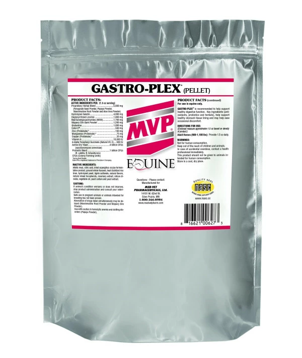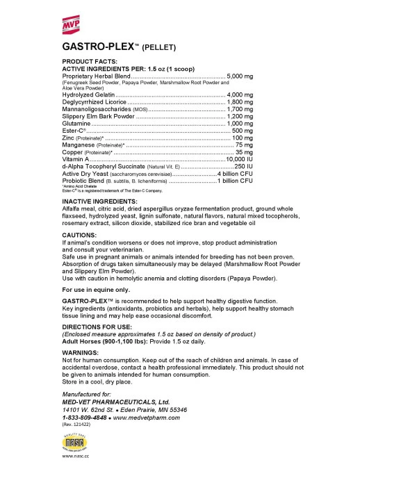 Gastro-Plex pellets support healthy digestive function in horses. It supports a healthy stomach lining and may help ease occasional discomfort. Also includes Levucell SC, a clinically researched, powerful yeast that helps reduce the risk of colic/digestive disorders by supporting the hindgut. Directions for Use: Adult Horses (900-1,100 lbs): Provide 1.5 oz. daily. Pellets
