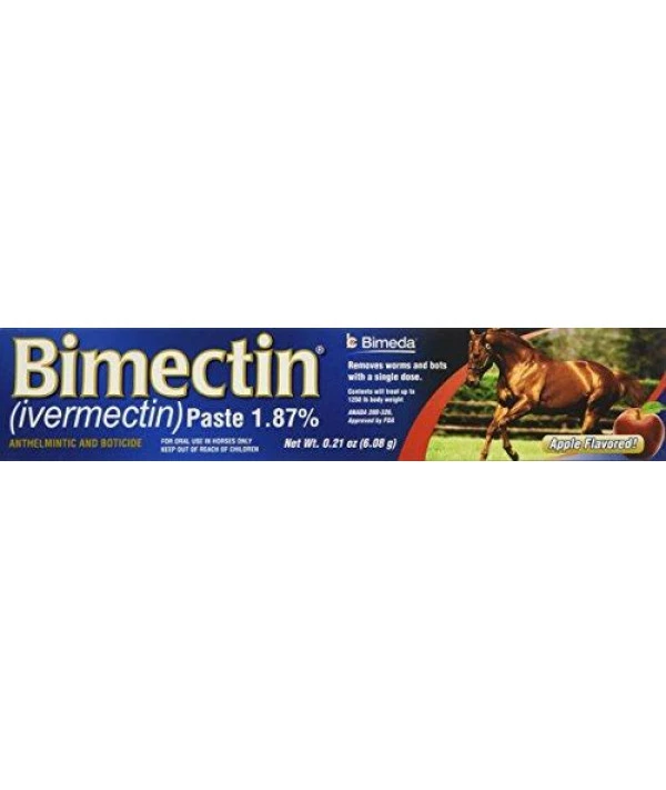Bimectin, 0.21 oz, apple flavor, equine dewormer paste, syringe, an anthelmintic & boticide that removes worms & bots with a single dose, contains ivermectrin & a boticide, each 6.08 gram tube treats up to 1,250 lb of body weight, active ingredient: ivermectin.