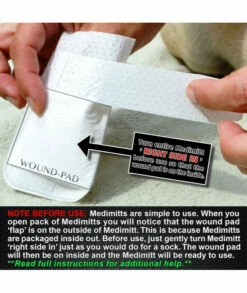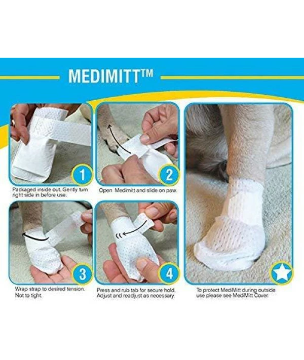 EASY TO APPLY:Packaged inside out. Gently turn right side in before use. Open MediMitt and slide on paw. Wrap strap to desired tension. Not too tight. Press and rub tab for secure hold. Adjust and readjust as necessary. Note: To protect MediMitt during outside use, please see our MediMitt Cover