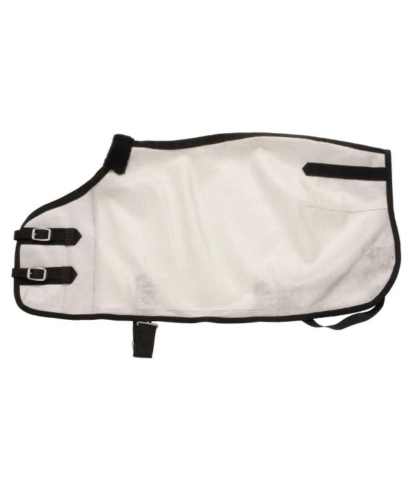 Tough-1 Miniature Horse Deluxe Fly Scrim Sheet Nylon mesh fly sheet protects against sun and insects while allowing for natural air circulation around the horse. Features: Double Buckle Front Closure Crossed Belly Surcingles Adjustable Leg Straps Item Specifications: Color: White with Black Trim Material: Nylon Mesh