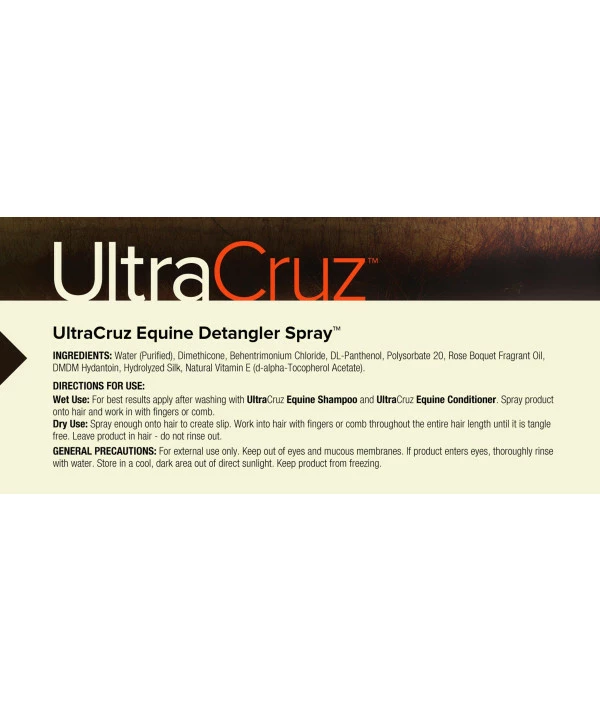 UltraCruz Equine Detangler Spray removes tangles and knots while simultaneously fortifying hair for longer, healthier growth. Hydrolyzed Silk proteins bind to hair shaft leading to stronger hair, which works together with moisturizing agents to create a slip-free soft and Shiny appearance. This easy to use spray prevents breakage, which results in more manageable hair and leaves the mane and tail looking healthy and Shiny.