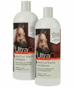 Ultra Cruz Equine Shampoo is a specially formulated shampoo for horses that contains a unique blend of naturally based cleaning agents enriched with proteins, vitamins, moisturizers and emollients to thoroughly clean hair without stripping natural oils. This high quality shampoo is lightly scented with Sage, Chamomile and Peppermint, and produces a rich lather to gently but thoroughly remove dirt and debris from the coat, mane and tail for a soft, shiny appearance. ??Ultra Cruz Equine Shampoo is pH balanced specifically for horses to provide optimum body, shine and manageability without causing irritation or dryness of the skin. This shampoo is therefore safe to use on horses of all ages. Hydrolyzed Collagen proteins work together with moisturizing agents, Aloe Vera and Vitamin E to restore the natural protein-moisture balance to strengthen the hair, leading to longer growth and healthy shine. ??Ultra Cruz Equine Conditioner is a lightly scented conditioner and demineralizer that is specially formulated with a blend of effective moisturizers, amino acids and proteins to help give your horse a lustrous, silky appearance. This high quality conditioner can be used as a leave-in or rinse-out conditioner depending on the hair type and desired look. ??This comprehensive formula strengthens and moisturizes hair to prevent breakage and split ends while simultaneously nourishing the skin to prevent drying, flaking and scaling. Hydrolyzed silk and collagen proteins bind to hair to strengthen the shaft for longer, healthier hair. Ultra Cruz Equine Conditioner works instantly to deeply condition, removing residues and build-up of minerals and chemicals left in the hair.