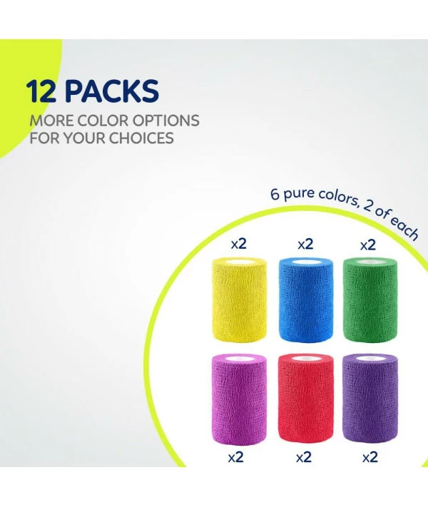 [SIZE & COLOR]: 3 Inch x 5 Yard (Stretched), 6 Solid Colors, 2 Rolls of each solid color, 12 Rolls. | [ELASTIC & COMFORTABLE]: WePet wrap can be stretched to be 2.5 times longer. It provides furry friends with support, protection and security. It feels soft and can conform around contours that are difficult to wrap. | [STRONG SELF-ADHESIVE]: WePet wrap sticks to itself but NOT to fur making it pain-free to pull off. Don’t worry about any adhesive residue. It? very easy to tear by hand. | [LIGHTWEIGHT BREATHABLE MATERIAL]: It is made from natural rubber latex. Porous fabric allows for ventilation so your pet? skin can breathe freely underneath, which is good for the pet? skin and helps healing better and faster. Each roll is individually wrapped in clear cellophane, clean and hygienic. | [100% SATISFACTION POLICY]: All WePet products are fully covered by our customer satisfaction program. If you are not happy about the product, or it fails your expectation, please feel free to let us know. We will meet all your needs and deliver satisfaction without asking any question.Features