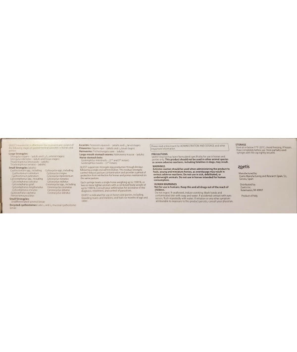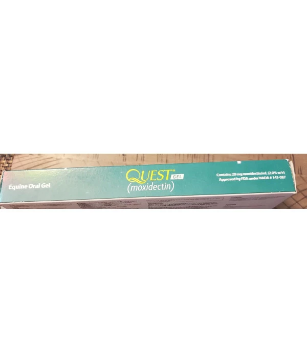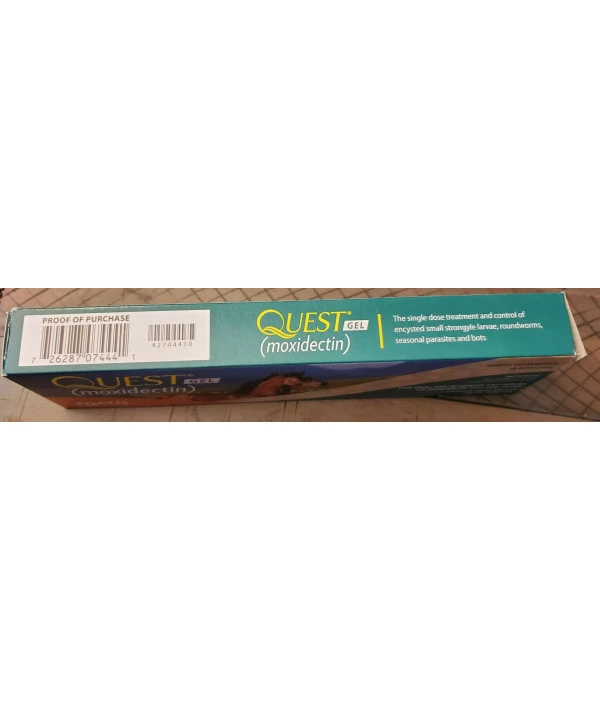 Quest Gel Horse Dewormer 2% Moxidectin, clear gel wormer for horses. Use in horses and ponies six months of age and older. Improved syringe allows for accurate dosing. Gel melts in the horses mouth to prevent waste. Quest Gel is used to aid in the control of: hairworms stomach worms bots encysted small strongyles Treats up to 1500 lb. View manufacturer and/or label information